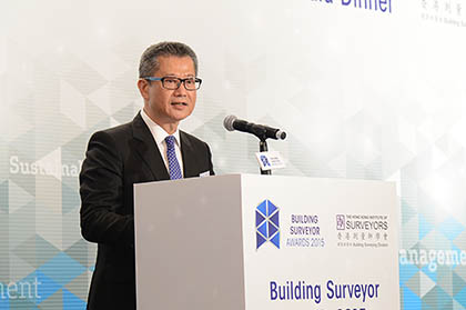 ► Mr. Paul CHAN Mo-po, MH, JP, Guest of Honor of the ceremony, delivered the keynote speech. Mr CHAN emphasized the importance of the role of Building Surveyors in the future development especially the increasing demands for green building and heritage conservation